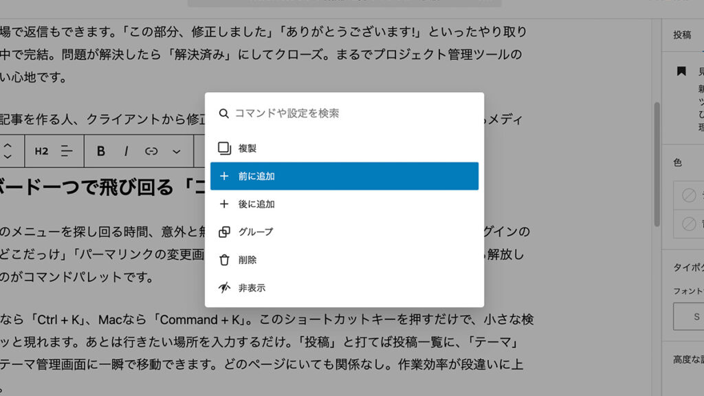 管理画面のメニューを探し回る時間、意外と無駄だと感じたことはありませんか。「あれ、プラグインの設定ってどこだっけ」「パーマリンクの変更画面、どこから行くんだっけ」。そんな迷子状態から解放してくれるのがコマンドパレットです。
