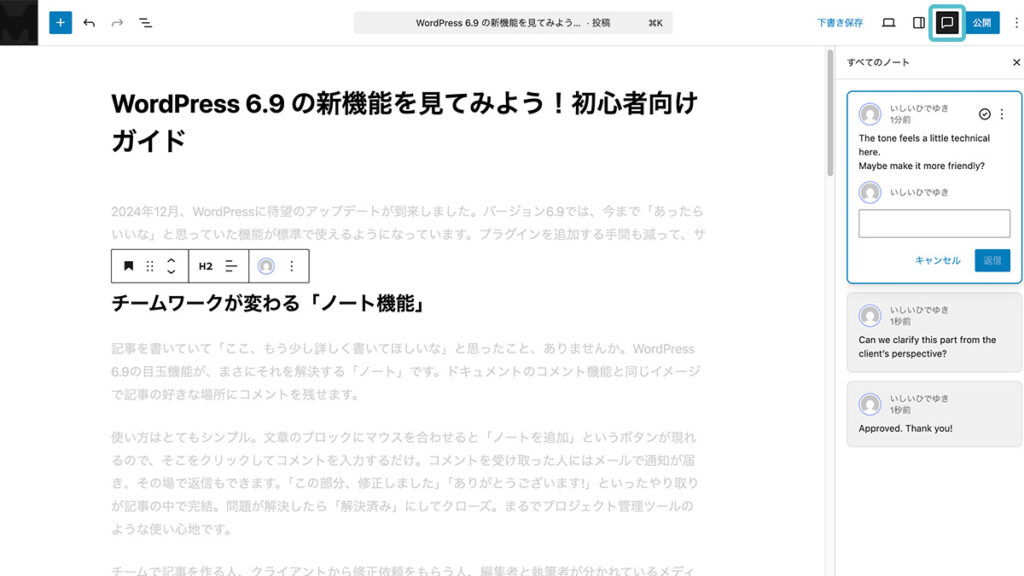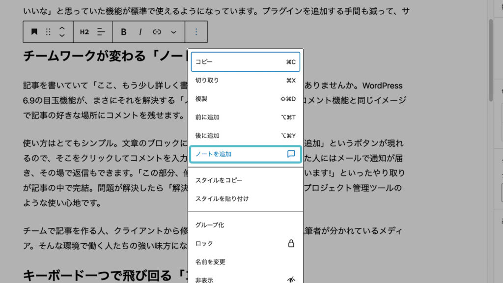 記事を書いていて「ここ、もう少し詳しく書いてほしいな」と思ったこと、ありませんか。WordPress 6.9の目玉機能が、まさにそれを解決する「ノート」です。ドキュメントのコメント機能と同じイメージで記事の好きな場所にコメントを残せます。